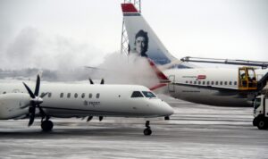 Flyet måtte gjennom avising! Het vliegtuig moest door de de-icing, alwaar chemicaliën over het vliegtuig worden gespoten om restanten ijs te verwijderen en om nieuwe aanwas te voorkomen