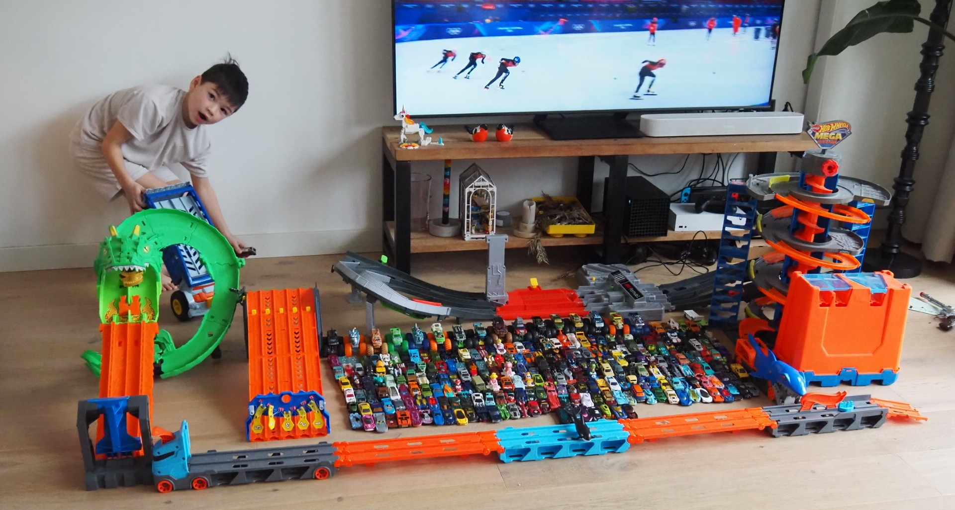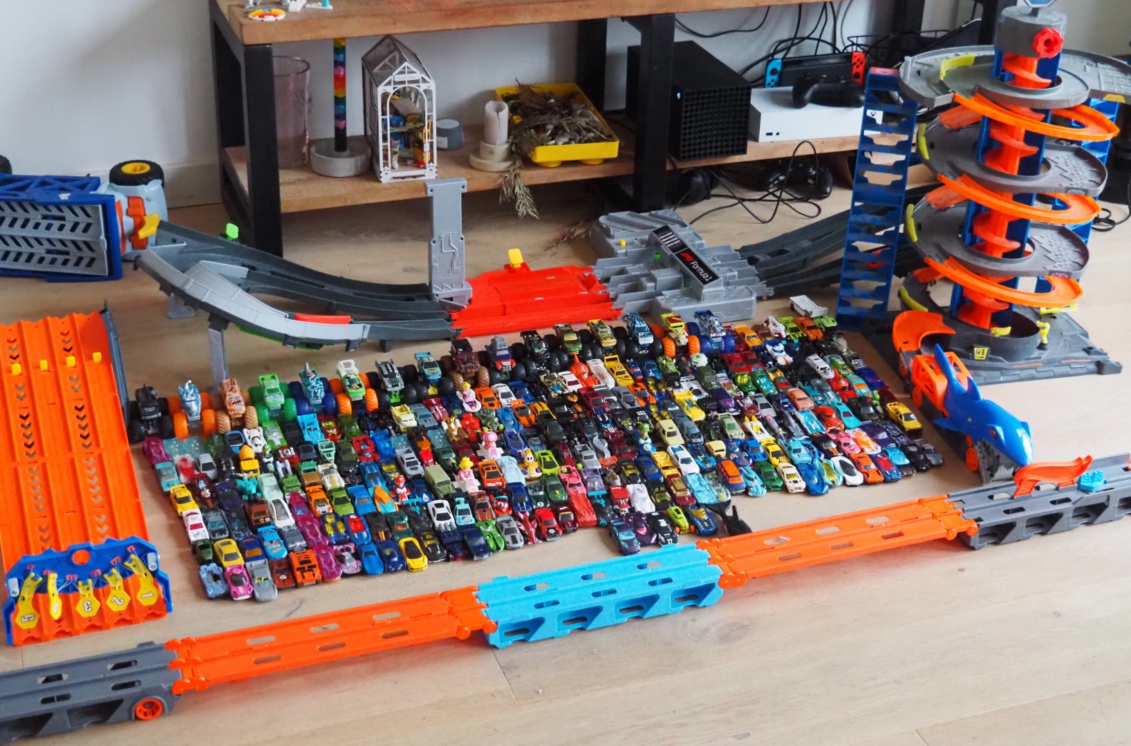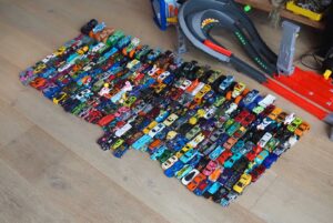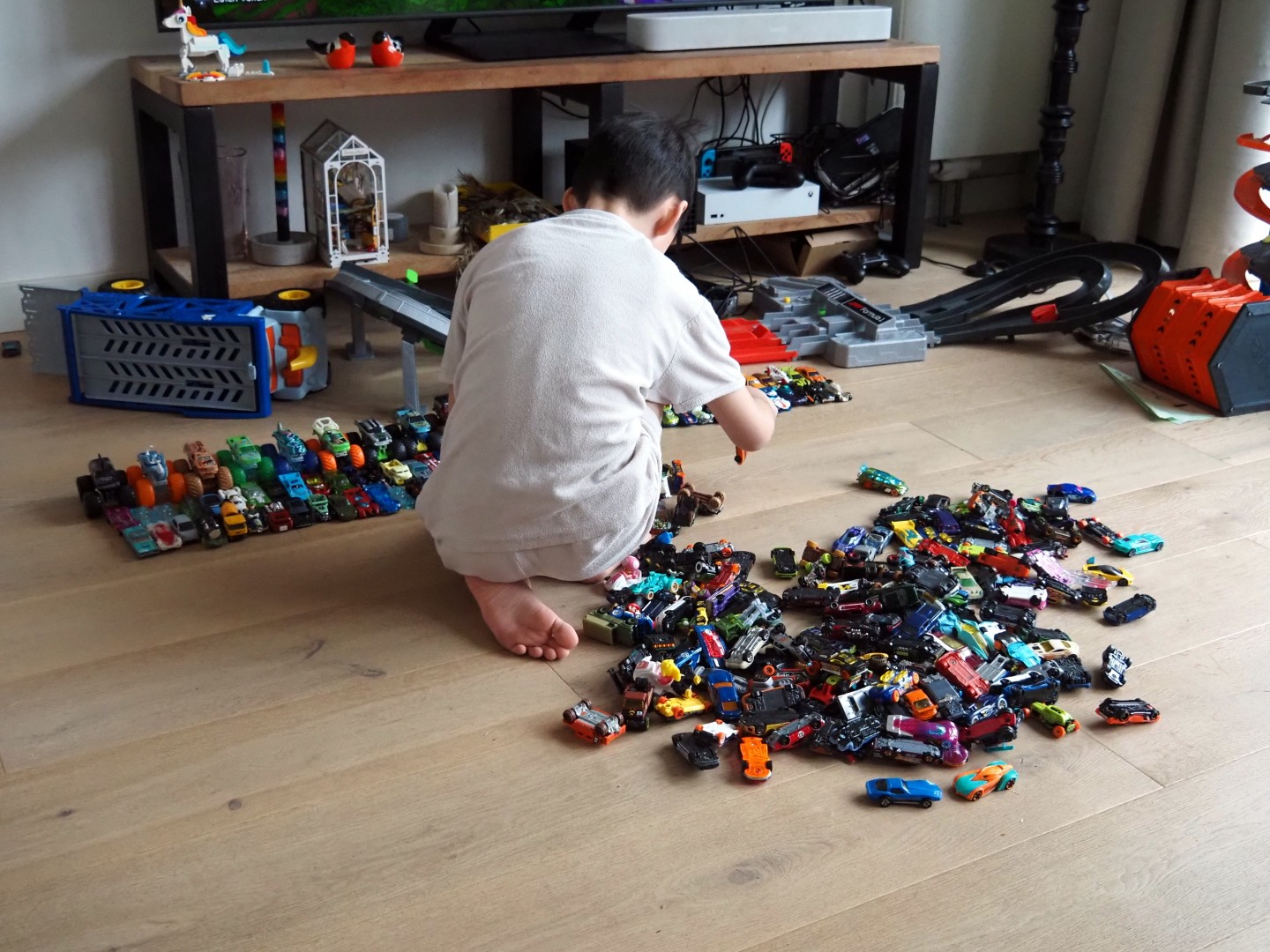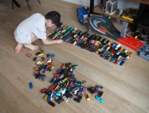 Oma (farmor) tar et bilde, når du setter alle bilene på rekke og rad… Ik maak een deal met Mink. Als hij alle monster trucks op een rij zet, maak ik een foto