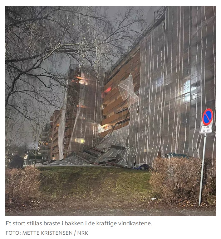 Et stort stillas i Oslo braste i bakken i de kraftige vindkastene. Foto: Mette Kristensen / NRK. Folk i Oslo skulle holde seg innendørs. Een grote stelling van 8 etages stortte in Oslo naar beneden. Oslogangers werd aangeraden om binnen te blijven! LINK = https://www.nrk.no/norge/stillas-raste_-kirketak-losnet-og-vei-er-stengt-av-flom