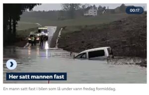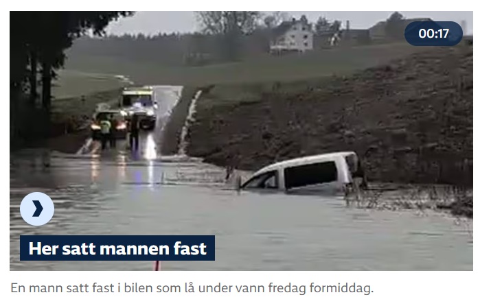 En mann måtte reddes ut av en bil som havnet under vann i Østfold. Overal is wateroverlast. Deze man moest uit zijn auto worden gered en hij was niet de enige! LINK FILM = https://www.nrk.no/norge/store-vannmengder_-biler-under-vann