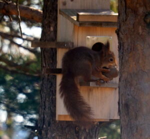 Det er ikke bare en svart katt som jakter ekorn, men også en grå og en lysebrun katt. Disse kattene er sikkert ikke sultne, men følger instinktene sine. Kunne ikke disse kattene ha på seg bjeller slik at de er bedre hørbare? For moren til disse ekornene har allerede blitt drept av en katt. Hun etterlot seg fem ekornunger. En liten døde uansett, men vi matet de andre fire og holdt dem i live. Disse små ekornene kommer fortsatt for å spise her daglig, men de savner en mor som lærte dem å forsvare seg mot katter. Redd ekornene på Mariås og gi katten en bjelle, vær så snill?!