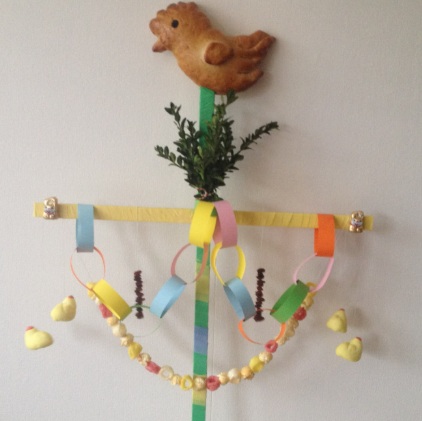 In Twenthe maakten wij een paasstok die wij versierden met suikereitjes en een broodhaantje op de top. We liepen dan met die stokken door het dorp en zongen. *Palm- palm-pasen….”