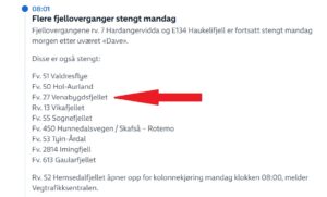 Venabygdsfjellet er 2. påskedag stengt. Ny vurdering kl. 21:00. Venabygdsfjellet is nog gesloten. Vanavond om 21 uur wordt opnieuw besloten of de bomen open gaan