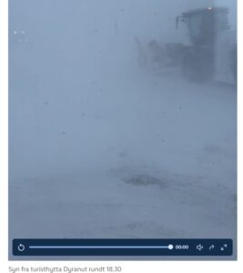 FILM: Syn fra turisthytta Dyranut rundt 18.30. Op deze FILM zie je hoe onmogelijk het er uit kan zien in de bergen, als het weer omslaat! Ieder jaar worden er mensen gered, die het weer in Noorwegen onderschatten! LINK = https://www.nrk.no/norge/_dave-treffer-sor-norge.-kraftige-farevarsler-for-rogaland-agder-Telemark-og-ostfold