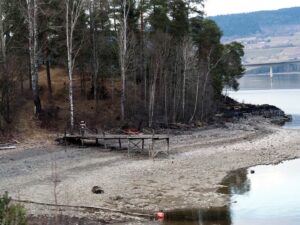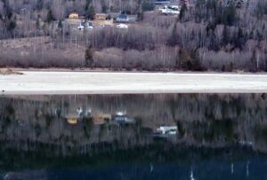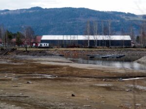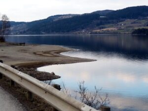Foreløpig seiler ingen båt inn eller ut av denne lille havnen på Mjøsa. Voorlopig vaart er geen boot in of uit dit haventje aan de Mjøsa