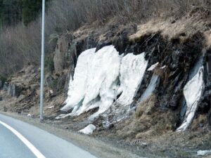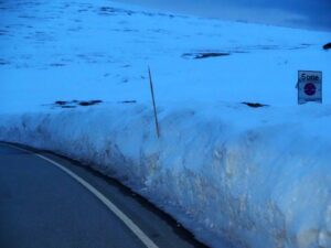 Toen waren we bij ”Lunden”, maar niet helemaal boven via de oprit. Want na Pasen moeten de spijkerbanden er af. Dus we rijden op zomerbanden. De oprit was nog lang niet in die zomerstemming met ijs, sneeuw en sneeuwdrap! Dus Harco moest alles naar boven sjouwen. Over stakker gesproken….