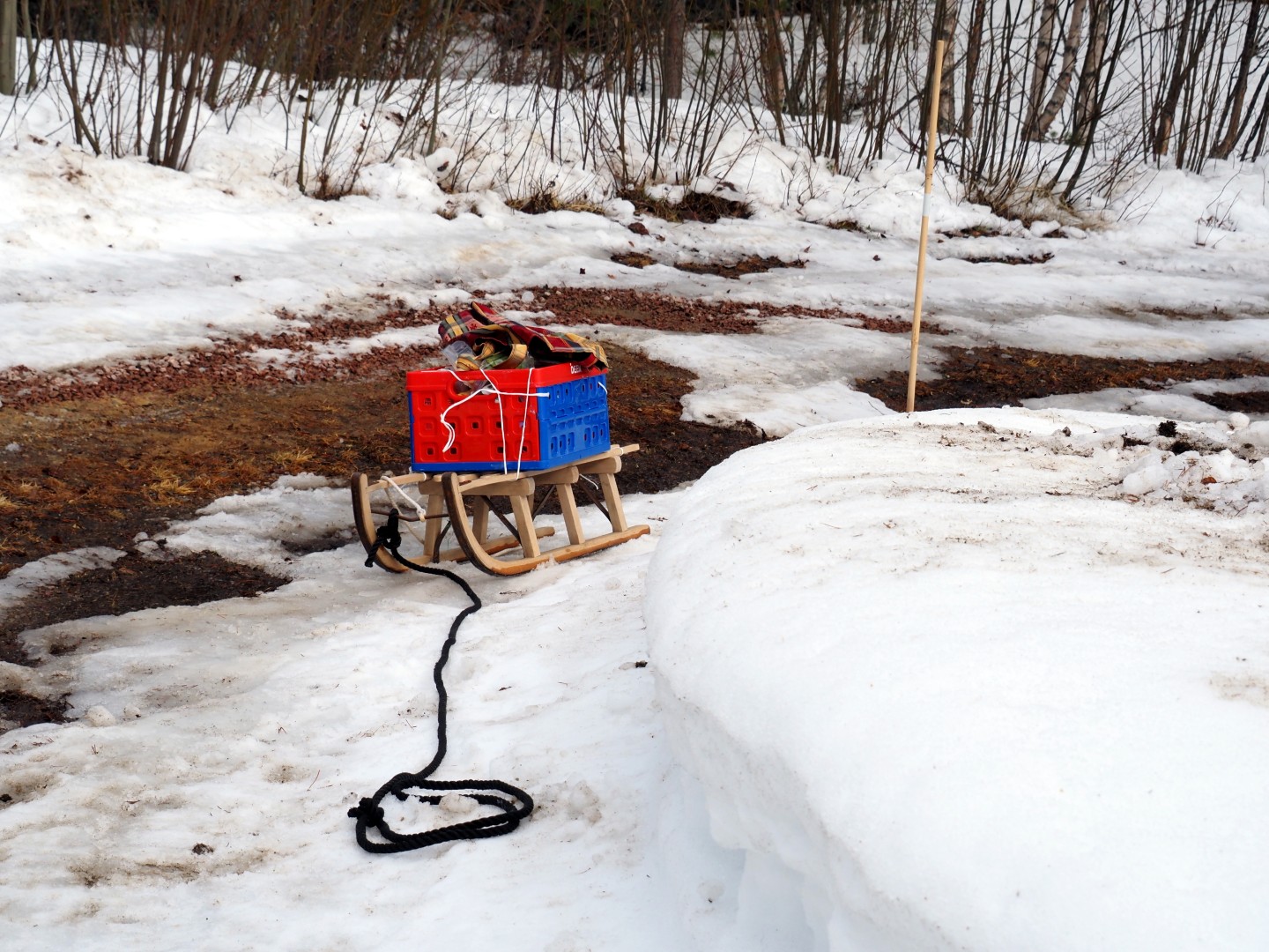 Toen waren we bij ”Lunden”, maar niet helemaal boven via de oprit. Want na Pasen moeten de spijkerbanden er af. Dus we rijden op zomerbanden. De oprit was nog lang niet in die zomerstemming met ijs, sneeuw en sneeuwdrap! Dus Harco moest alles naar boven sjouwen. Over stakker gesproken….