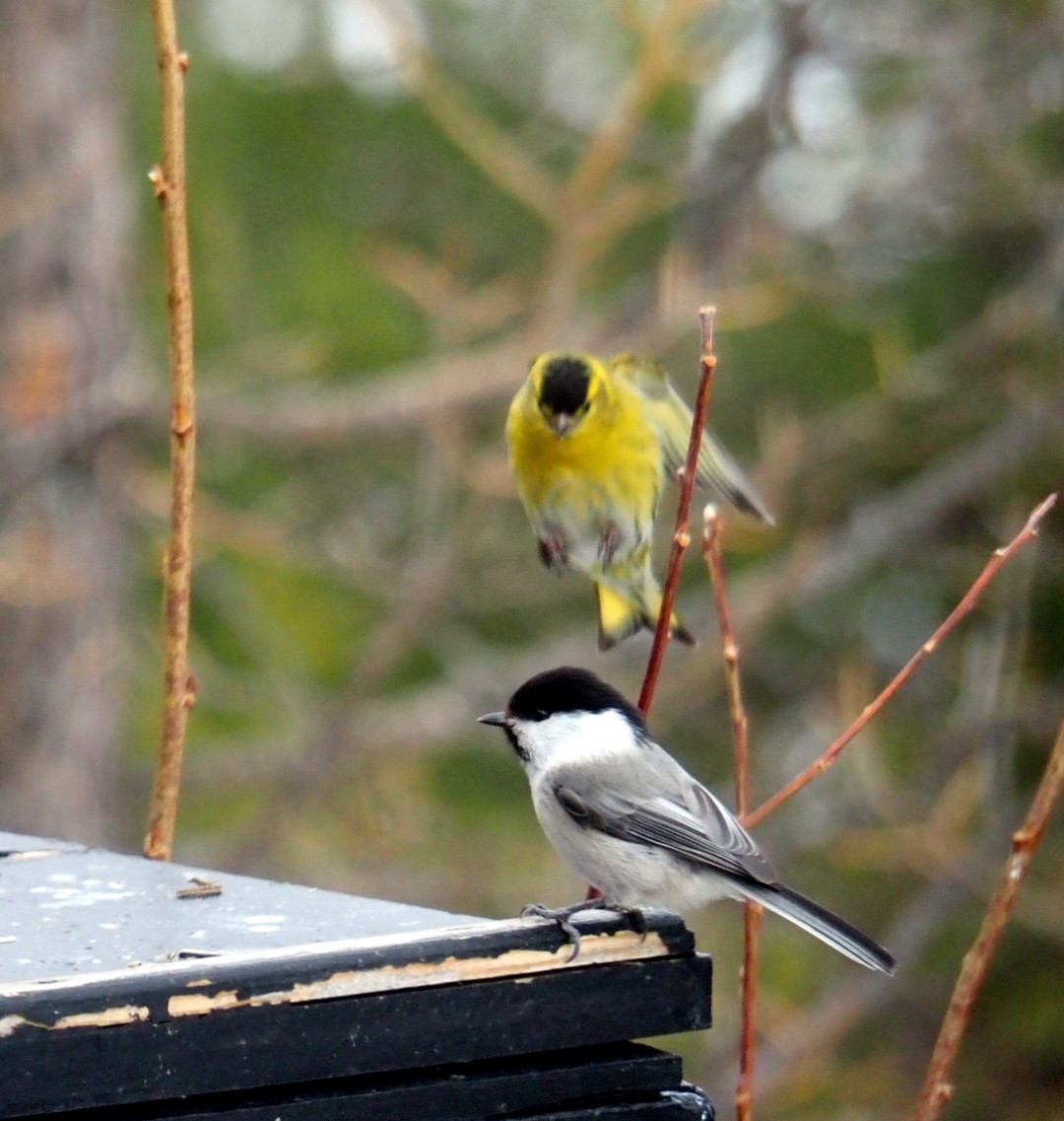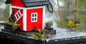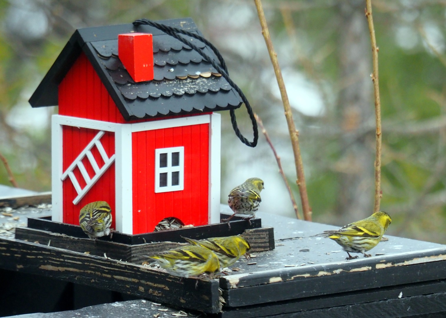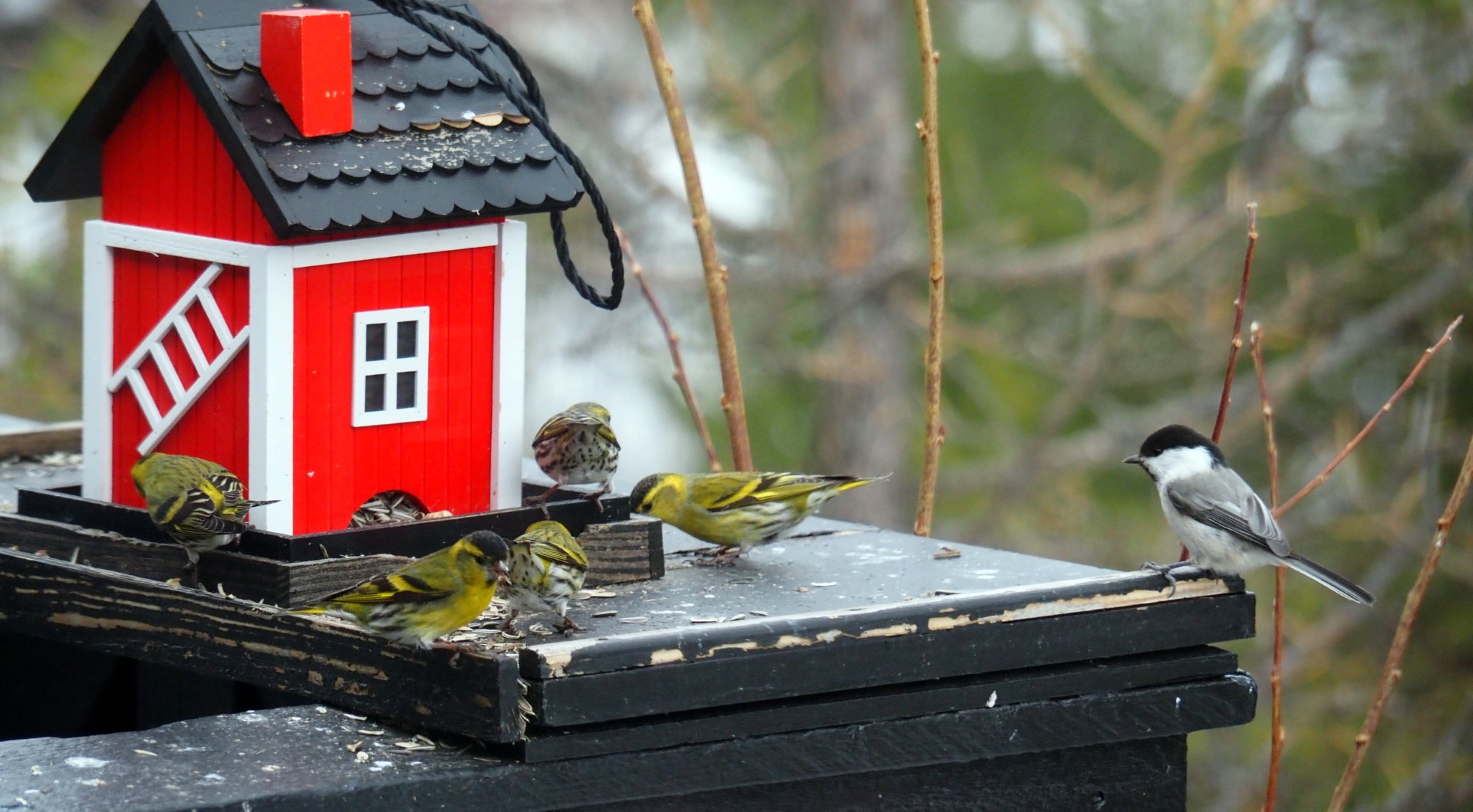 Granmeis, svarte meis, grønnfink, gråsisik. Matkop, zwarte mees, groenling en grote barmsijs