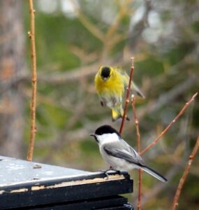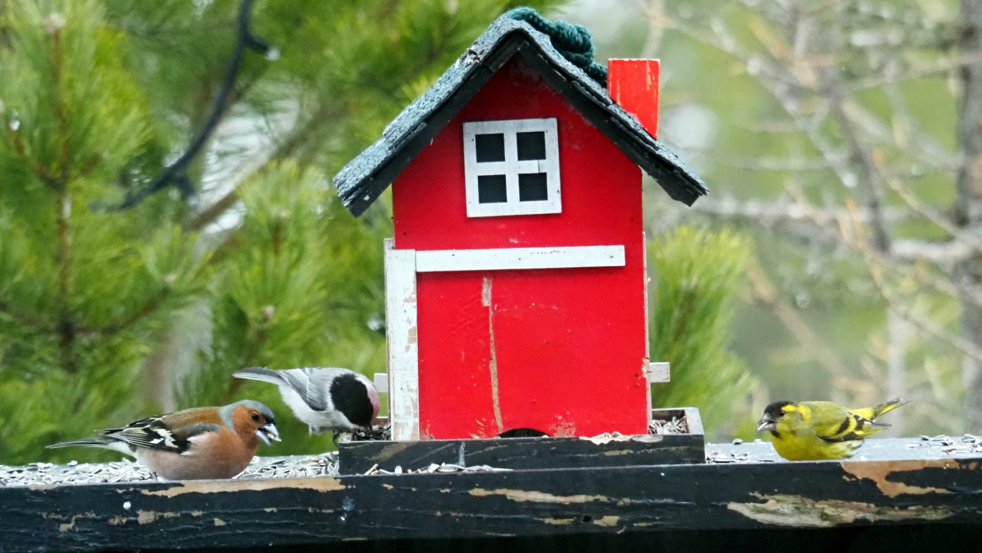 Miks av granmeis, bokfink og grønnsisik. Mix van matkop, vink en sijs.