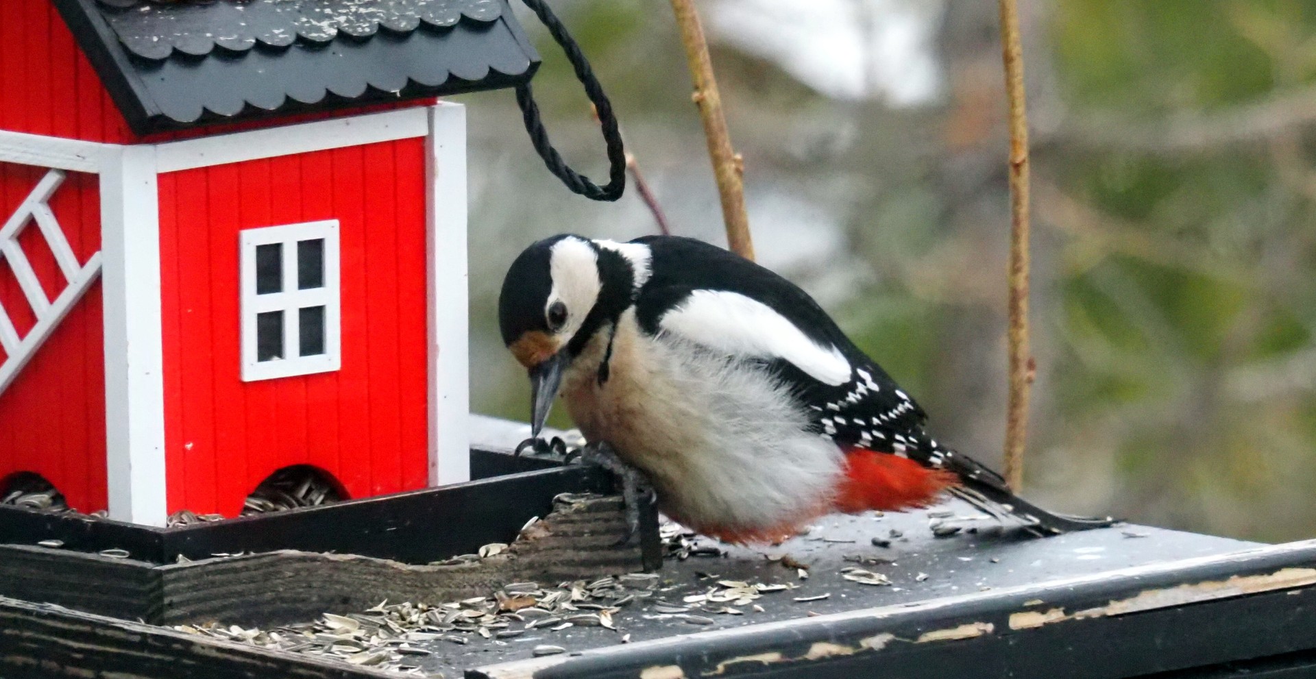 Flaggspetten banker på huset vårt. Heldigvis av og til! Deze grote bonte specht hamert los op ons huis. Gelukkig niet zo vaak…