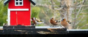 Til høyre: grønnfink og grønnsisik. Rechts: groenling en twee sijsjes