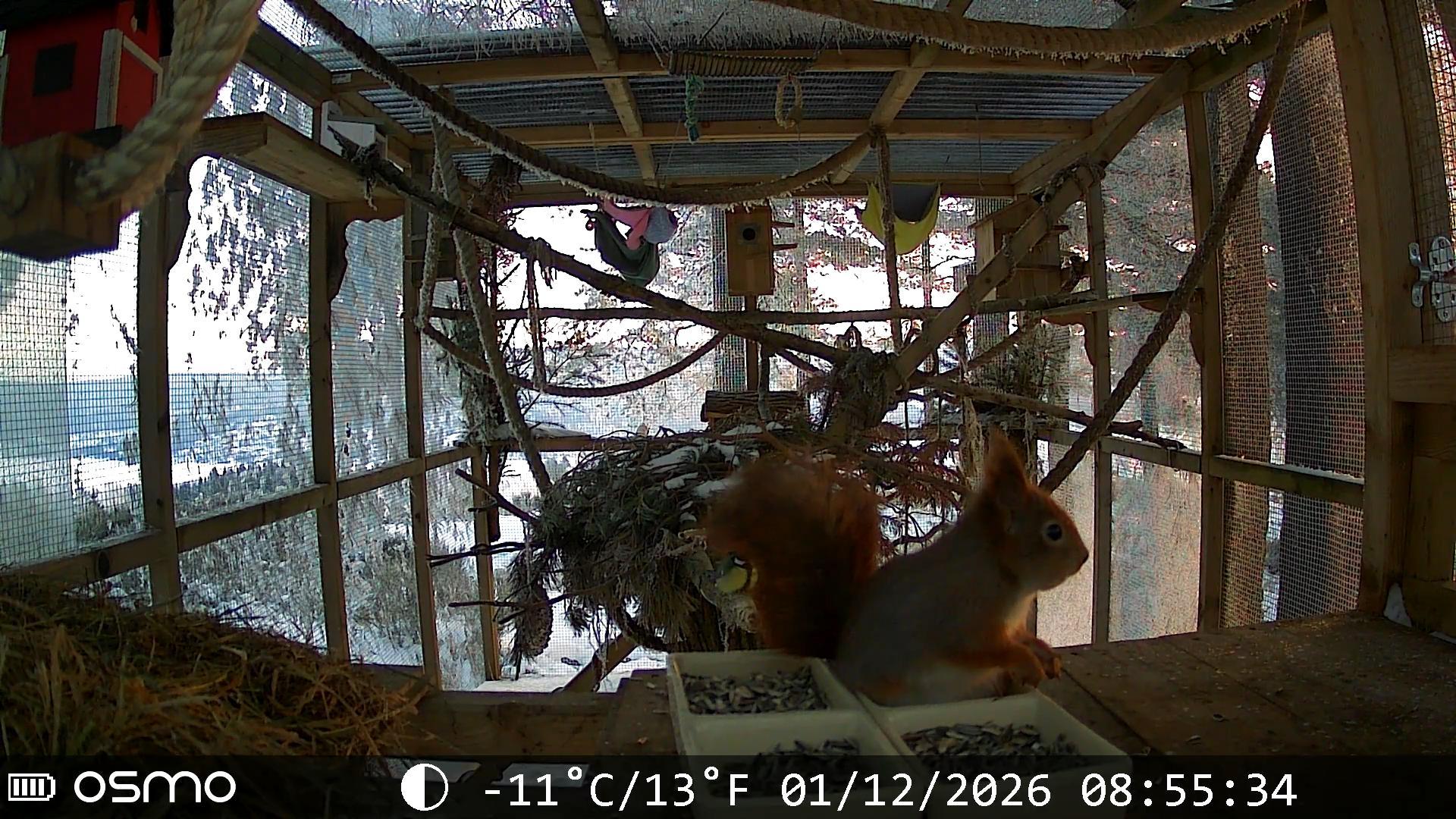6) De eekhoorn voorin is onrustig, zit in het etensbakje, gaat de kooi uit en een koolmees vliegt er in