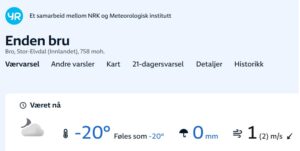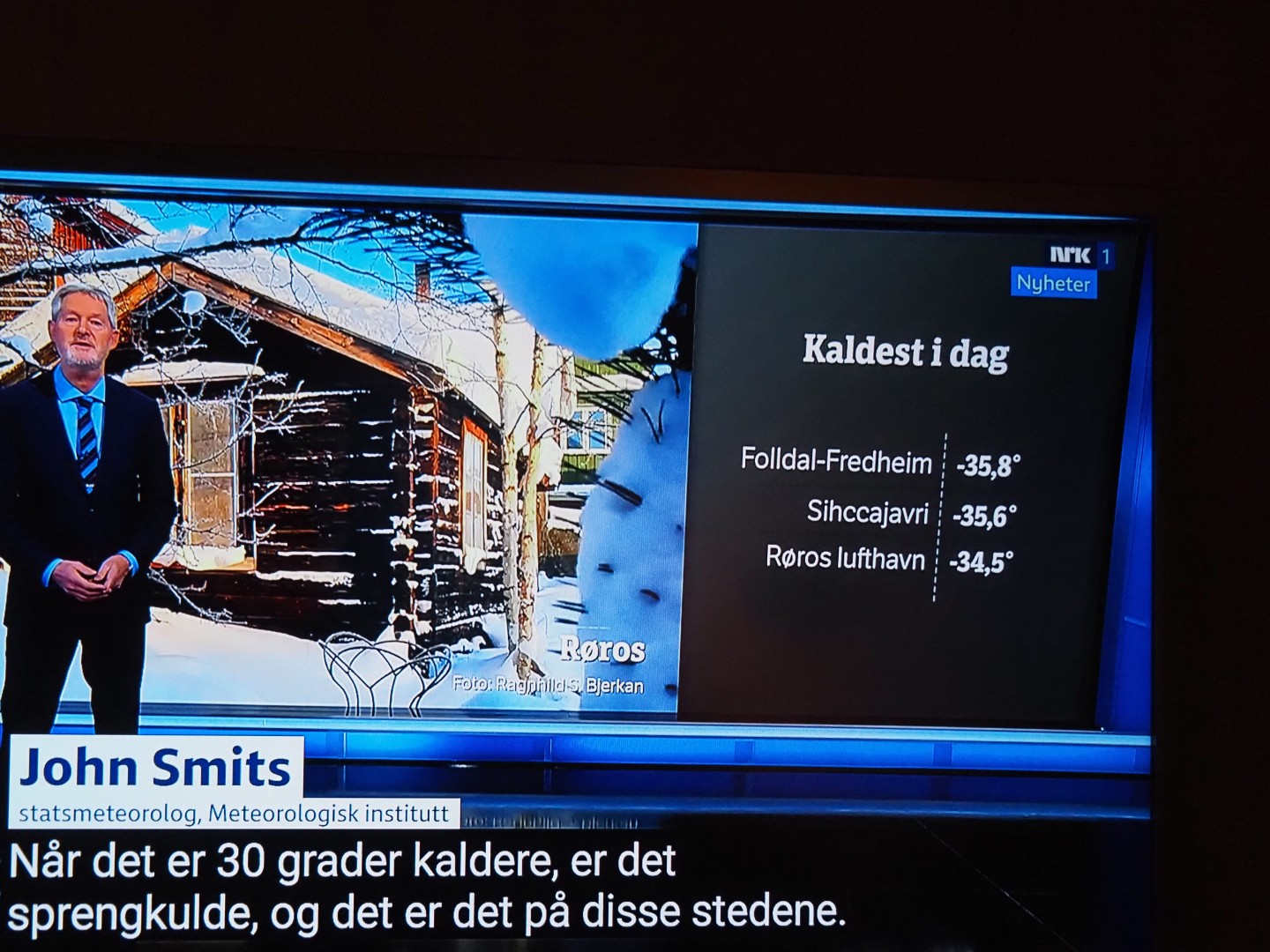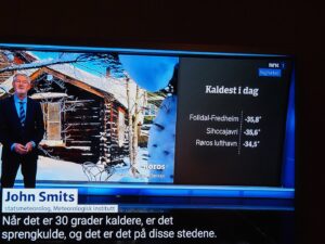 Toen wij van Enden naar Svelvik reden, was het -20º in Sollia. Dinsdag de 6e januari heeft Folldal, ons buurdorp, weer gewonnen als koudste plek in Noorwegen!