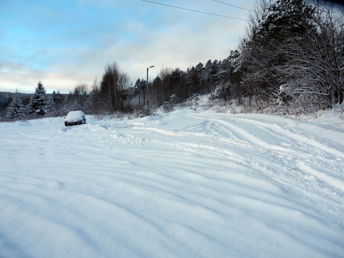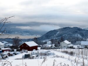 Ebbestadparkering er ikke brøytet ennå. Jeg gir full gass…. Ebbestad p-plaats is nog niet geveegd. Ik rijd er vol gas op…