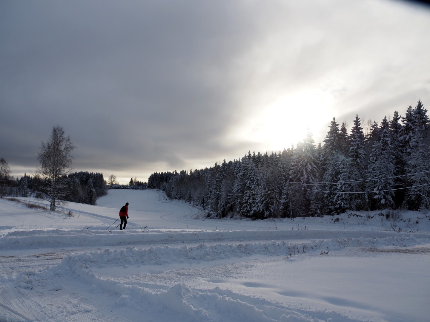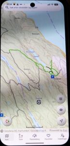 Den mørkerøde linjen var skituren min. Jeg tok først til høyre og deretter til venstre i krysset. De donker rode lijn is de skitoer van woensdag. Ik ging eerst rechts af en daarna linksaf bij de kruising