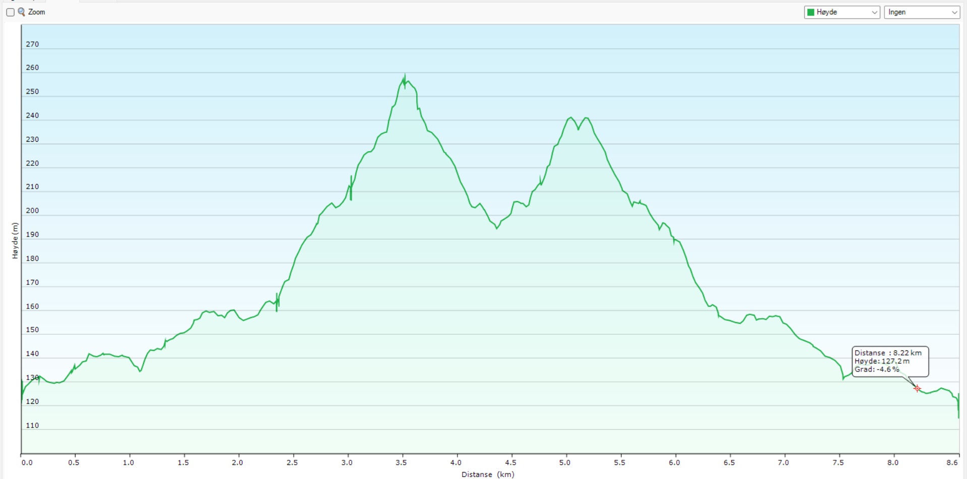 Tur diagram: høyde og avstand = 8,8 km x stigning 249m. Diagram: hoogte x afstand. Skitur 8,8 km, stijging 249 m, hardste snelheid 25km/uur