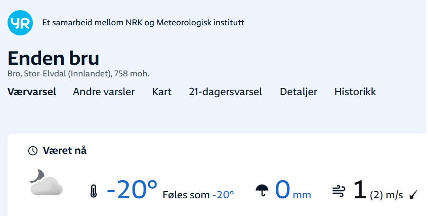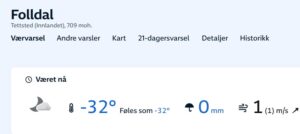 Da vi kjørte tilbake fra Enden til Svelvik, var det -20º i Sollia. Tirsdag den 6. januar har Folldal, nabolandsbyen, vunnet igjen som kaldeste by i Norge!