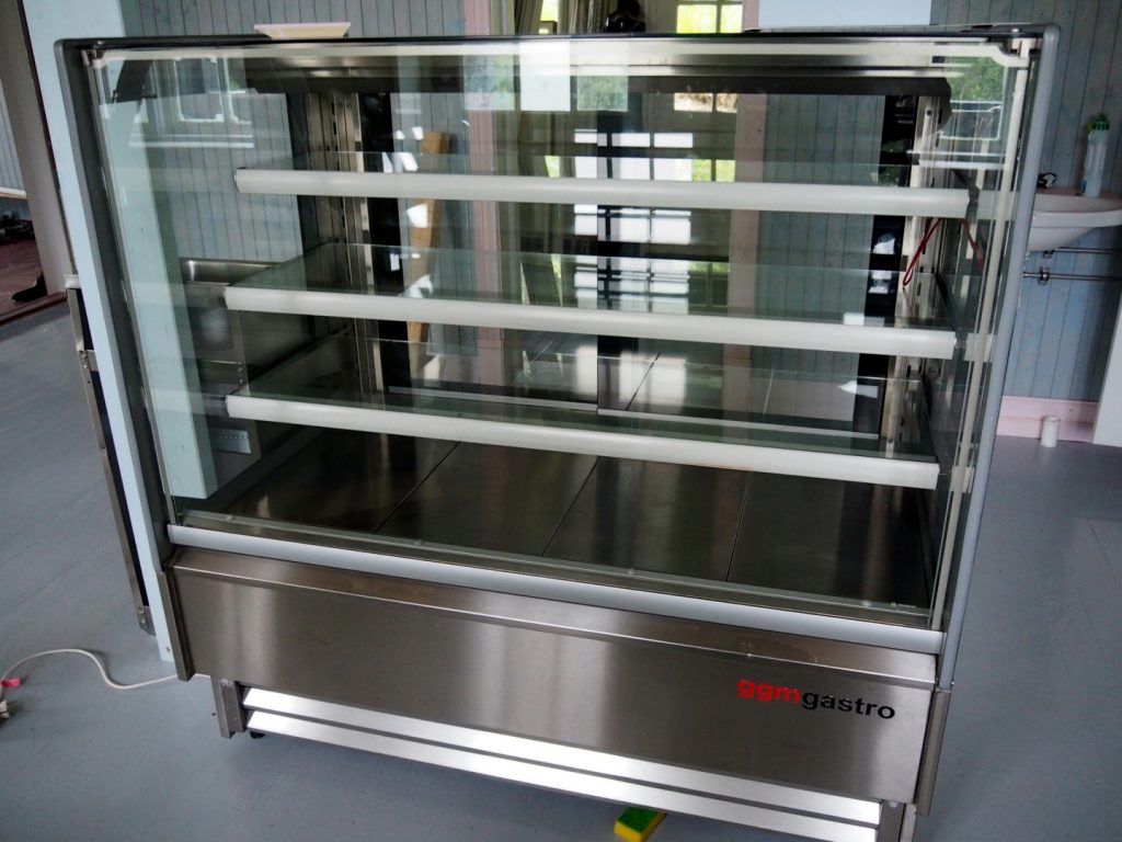 16. De vitrine wacht op de producten die hier straks worden verkocht, zoals witte geitenkaas, brunost, geitenworst en jam die Ellen-Mari ook nog maakt. Her skal selges produkter som hvit geitost, brunost, geitepølser og syltetøy som Ellen-Mari også lager