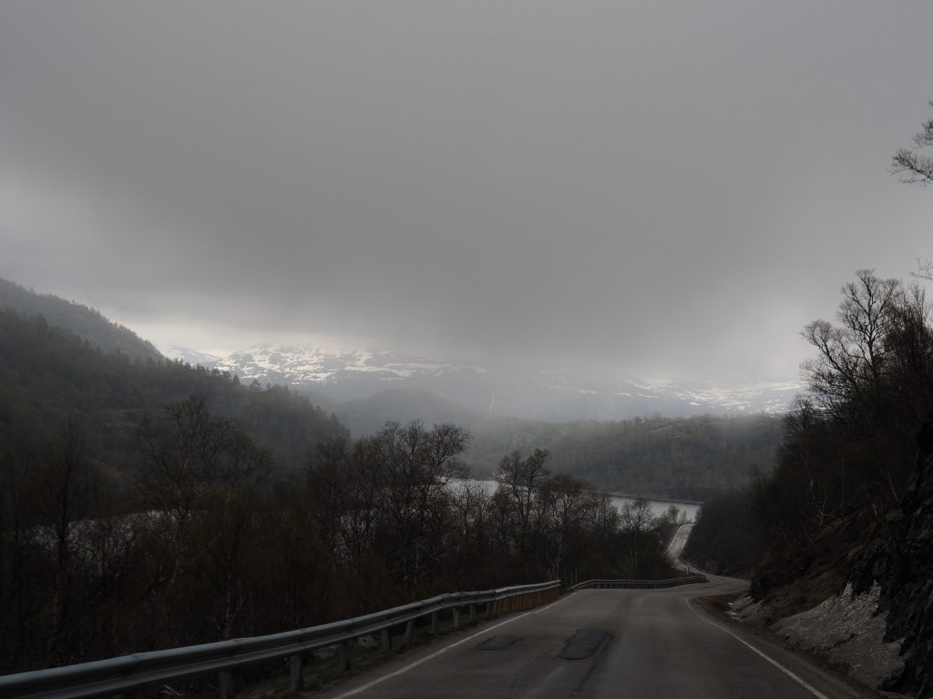 16. Haaaaa, stengt! Nee, niet door de Noorse wegwerkers, maar wij hebben dat zelf besloten. We wilden naar Lysebotn (einde Lysefjord) via bomveg Bergsdalen en Flogdalen, maar er hangt een vette, dikke mist! Dát wordt um niet!
